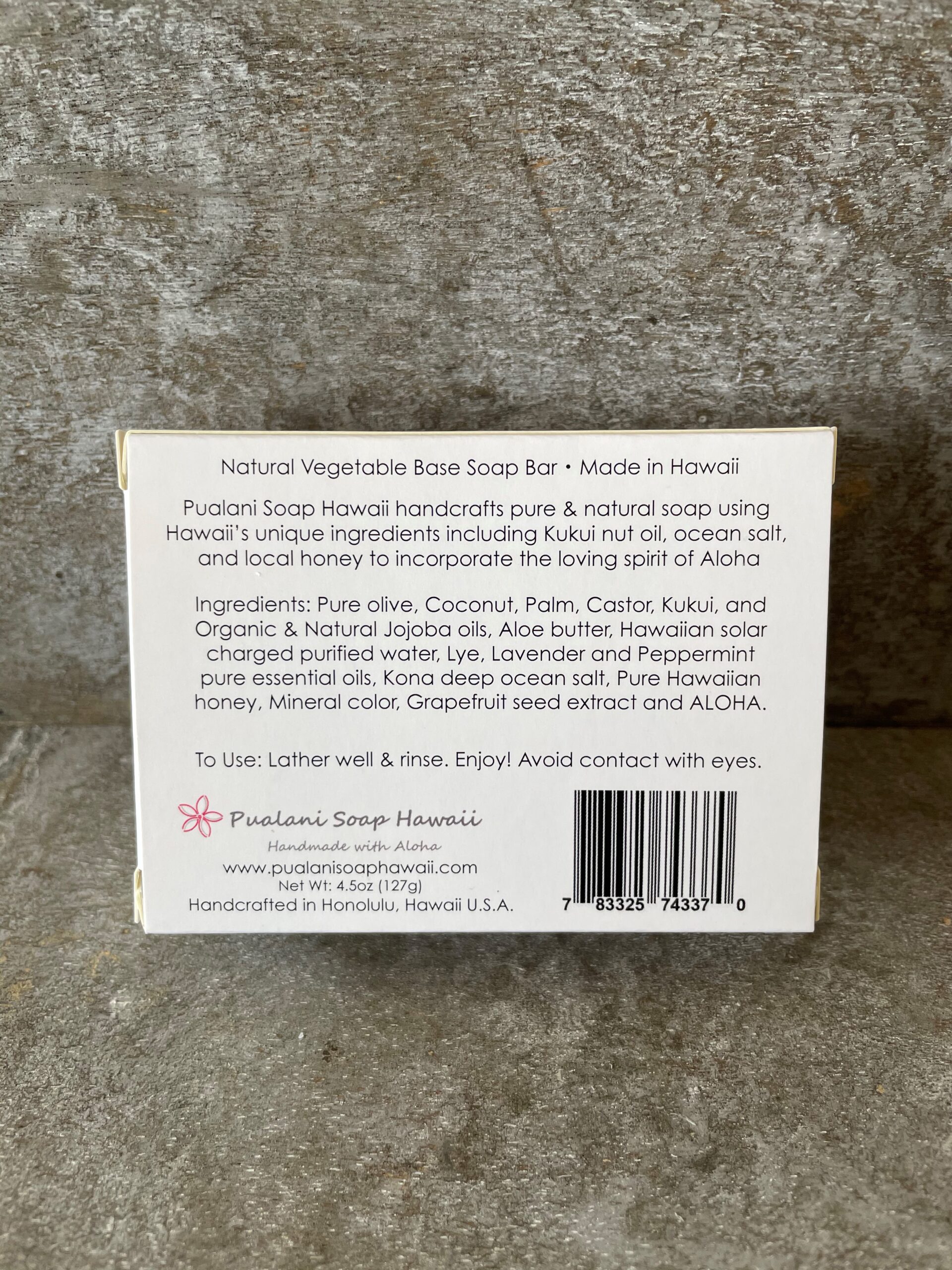 Pure olive oil, Coconut oil, Palm oil, Castor oil, Aloe butter, Hawaiian Kukui Nut oil, Organic and natural jojoba oil, Hawaiian solar charged purified water, Lye, Lavender and peppermint pure essential oil, Kona deep ocean salt, Mineral colors, Pure Hawaiian honey, Grapefruit seed extract, and Aloha