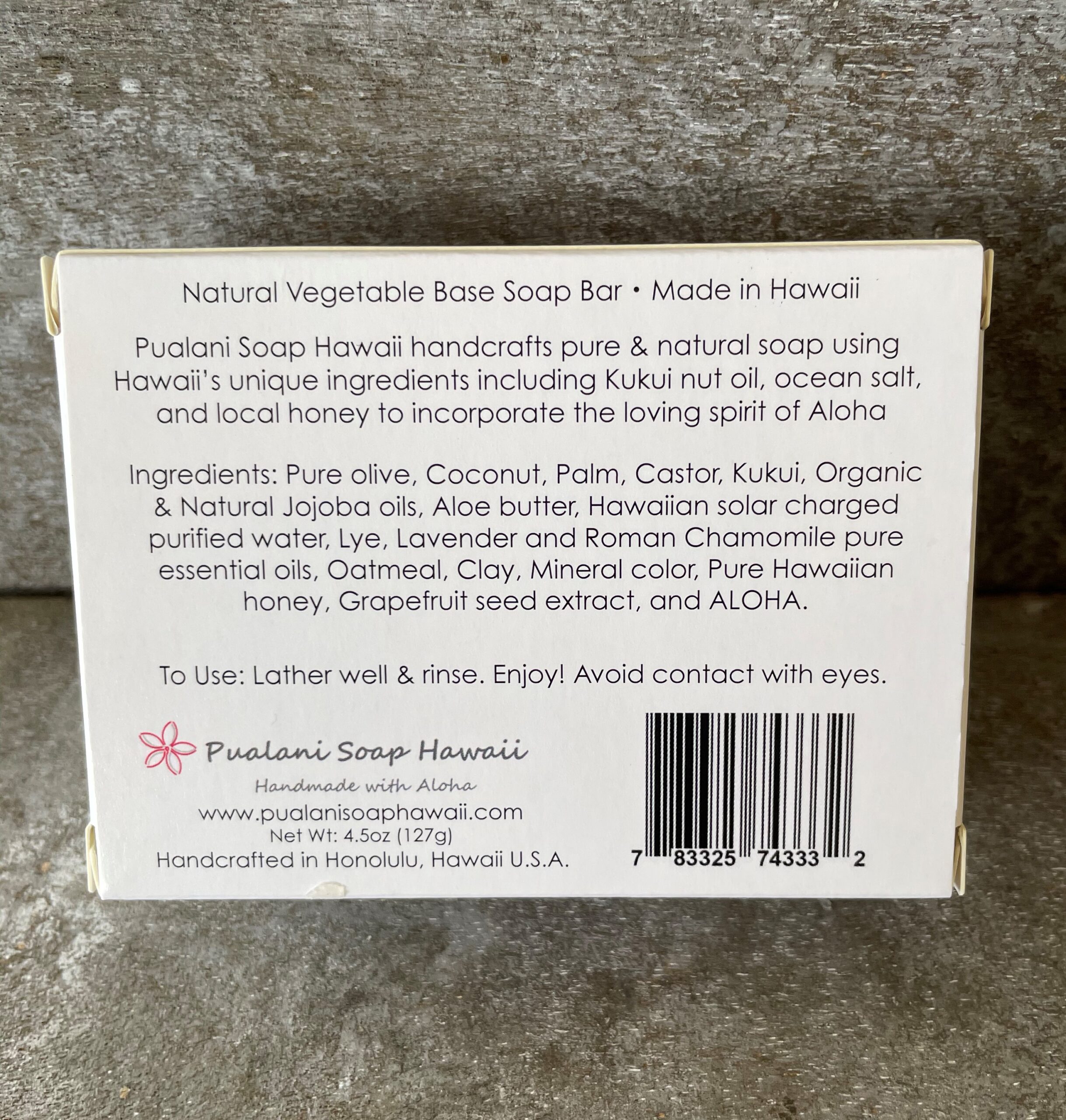 Ingredient List: Pure olive oil, Coconut oil, Palm oil, Castor oil, Aloe butter, Hawaiian Kukui Nut oil, Organic jojoba oil, Hawaiian solar charged purified water, Lye, Lavender & Chamomile pure essential oils, Ground oatmeal, Clay, Pure Hawaiian honey, Grapefruit seed extract, and Aloha